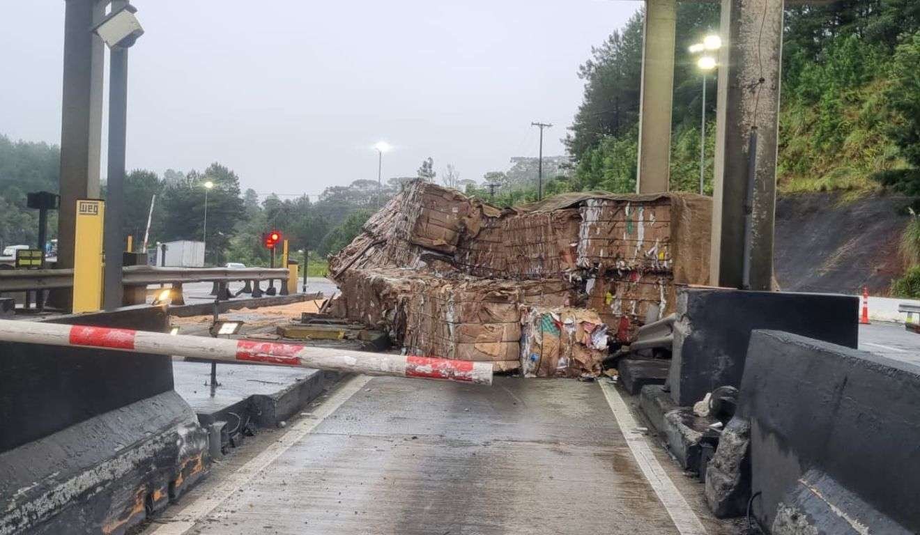 Um motorista de caminhão perdeu o controle do veículo após errar a cancela da praça de pedágio e ...