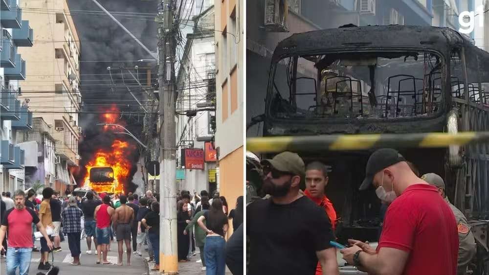 Um ônibus de turismo que transportava adolescentes pegou fogo após se enroscar em cabos de energi...