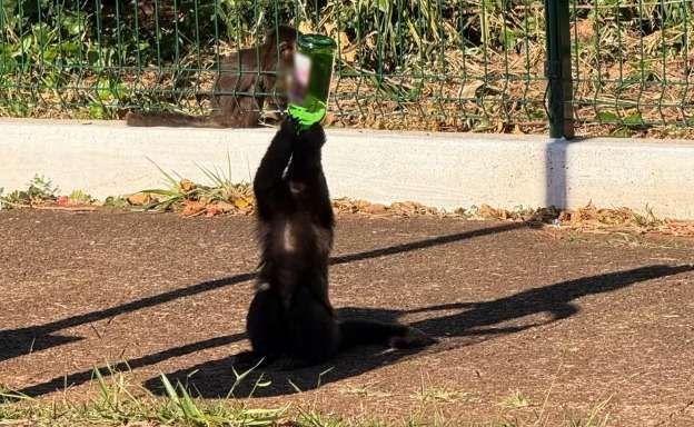 Um macaco-prego foi filmado "virando" na boca uma garrafa vazia de chope de vinho. O flagrante fo...
