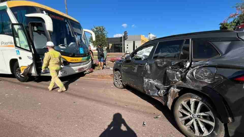 Idosa ficou ferida após um acidente entre carro e um ônibus na Avenida Tancredo Neves, no bairro ...