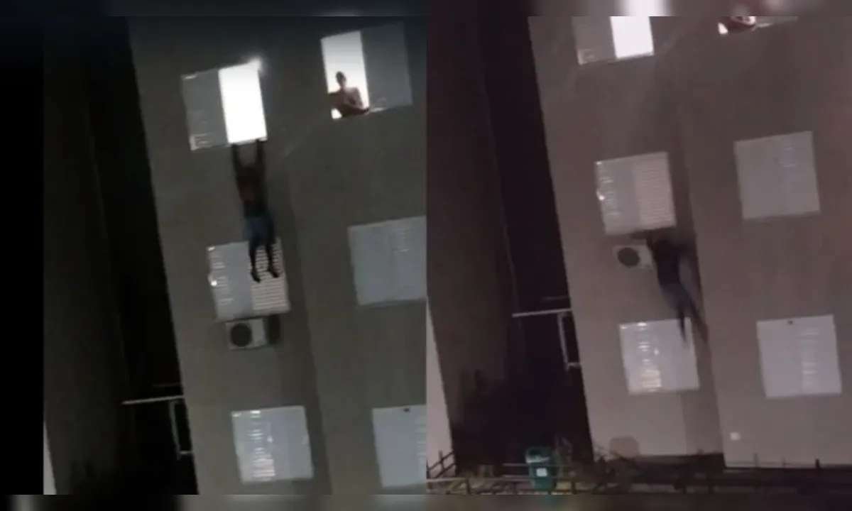 Imagens que circulam nas redes mostram o instante em que o homem salta pela janela. Durante a queda, ele atinge um aparelho de ar-condicionado e, em seguida, levanta-se e se afasta do local caminhando.