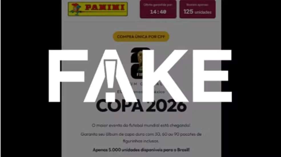 Ao clicar no link "saiba mais", os usuários são direcionados a um site falso que imita o da Panini, editora que comercializa o álbum oficial no Brasil. A página exibe o símbolo da empresa e apresenta mensagens e recursos que apelam ao senso de urgência, como um cronômetro em contagem regressiva para o fim da suposta oferta – tudo para pressionar os visitantes a comprarem rapidamente.