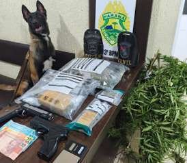 Com base na situação de flagrante, a equipe realizou a entrada no imóvel. Com o apoio de cães farejadores, foram localizados entorpecentes sobre a mesa da cozinha, além de balanças de precisão e dinheiro em espécie, indicando a prática de tráfico.